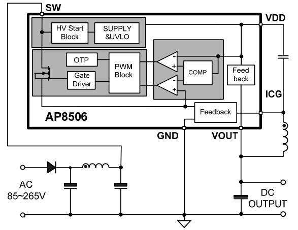 ¡¡¡¡AP8506Êǹ̶¨5V·Ç¸ôÀëоƬ»ùÓÚ¸ßѹͬ²½ÕûÁ÷¼Ü¹¹£¬¼¯³ÉPFM¿ØÖÆÆ÷ÒÔ¼°650V¸ß¿É¿¿ÐÔMOSFET£¬ÓÃÓÚÍâΧԪÆ÷¼þ¼«¾«¼òµÄС¹¦ÂʷǸôÀ뿪¹ØµçÔ´¡£AP8506ÄÚÖÃ650V¸ßѹÆô¶¯£¬ÊµÏÖϵͳ¿ìËÙÆô¶¯¡¢³¬µÍ´ý»ú¹¦ÄÜ¡£¸ÃоƬÌṩÁËÍêÕûµÄÖÇÄÜ»¯±£»¤¹¦ÄÜ£¬°üÀ¨¹ýÁ÷±£»¤£¬Ç·Ñ¹±£»¤£¬¹ýα£»¤¡£ÁíÍâAP8506¾ßÓÐÓÅÒìµÄEMIÌØÐÔ¡£
