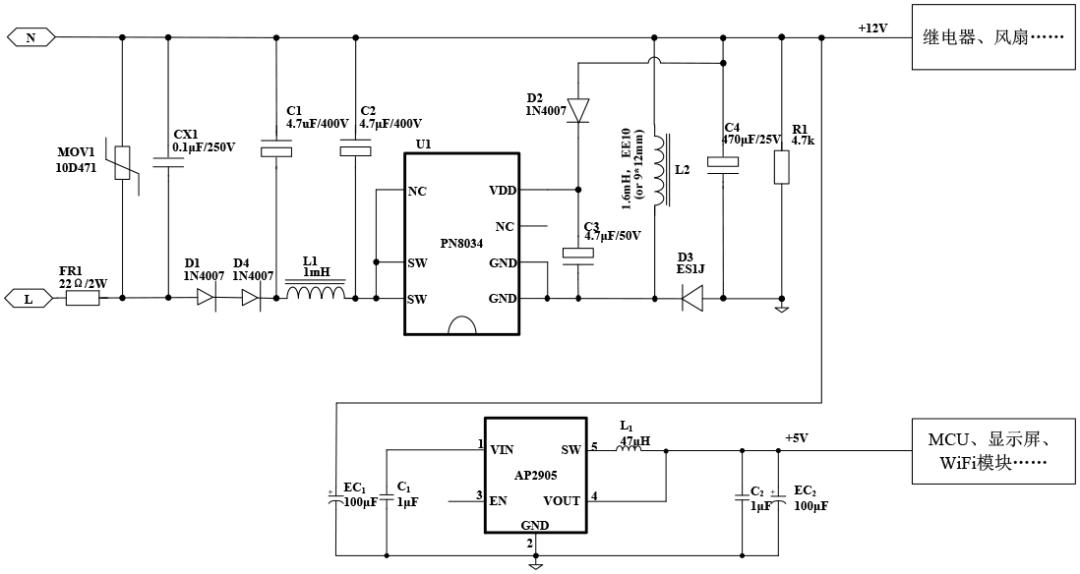 ¡¡¡¡ÔÚ¼ÒµçÓ¦ÓÃÖУ¬Êеçͨ¹ý·Ç¸ôÀ뿪¹ØµçÔ´PN8034ת»¯ÎªÖ±Á÷12VÊä³ö¸ø¼ÌµçÆ÷¡¢·çÉȵȸºÔØ£¬Í¬Ê±ÓÉAP2905½«12V½µÑ¹µ½5V×÷ΪMCU¡¢ÏÔʾÆÁ¡¢WiFiÄ£¿é¹©µç¡£