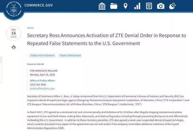 2018年4月16日中兴被制裁,美国商务部发布公告称,美国政府在未来7年内禁止中兴通讯向美国企业购买敏感产品,随后中兴以10亿美元外加更换董事局成员的条件让美国放弃了对它的制裁。