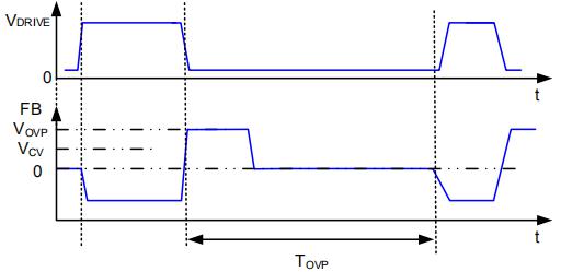 ¡¡¡¡µ± FB ¹Ü½Åµçѹ³¬¹ý¹ýѹ±£»¤µçѹ VOVP=6.6V ʱ£¬Êä³ö¹Ø¶Ï¡£¸Ã״ֱ̬µ½ VCC ½µµ½¹Ø¶ÏµçѹÒÔϵçÂ·ÖØÐÂÆô¶¯¡£